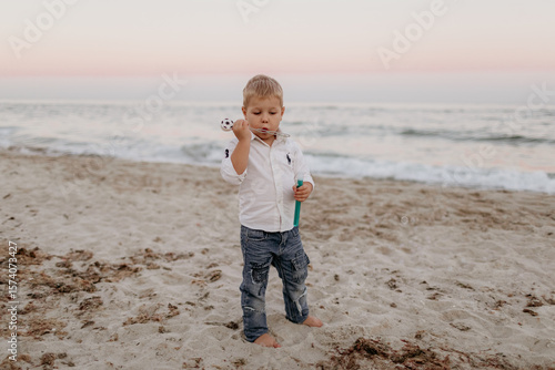 little boy at sea on the beach in summer