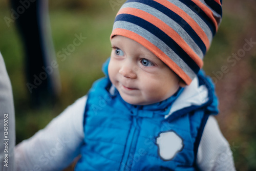 little boy in blue in the autumn park