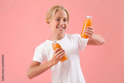 Little boy with bottles of orange juice on pink background
