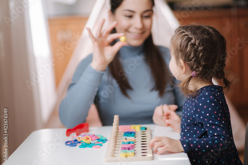 Little girl play in educational game for children with mom. Wooden game with different colors and numbers. Intecactive game for clever kids. Mom teaches child recognize colors using balls