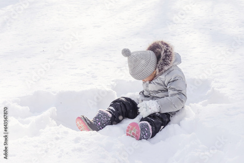 Little girl playing with snow in the winter park. Winter activities for children. Cute kid has fun ourdoor in winter park