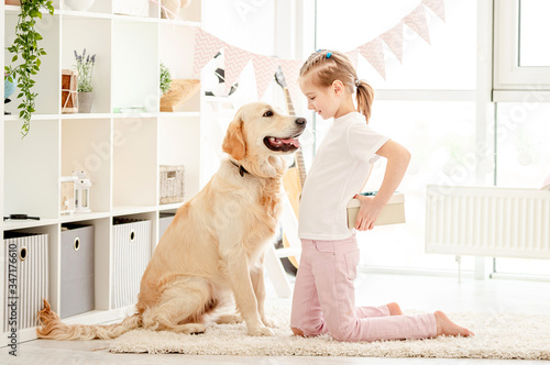 girl, dog, gold, retriever, cute, happy, beautiful, smile, smiling, pretty, children, children, adorable, lovely, little, cheerful, happiness, friendship, joy, indoor, leisure, funny, fun, animal, pet, home, gift, box, sweet, present, together, female, nice, positive, schoolgirl, joyful, relax, casual attire, attractive, schoolchild, playroom, room, toy, light, apartment, emotional, interior, cuddle, petting