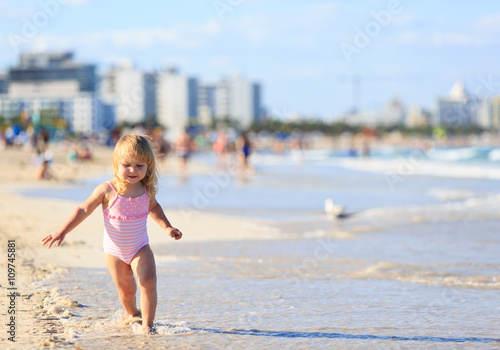 little girl run play with waves on the beach