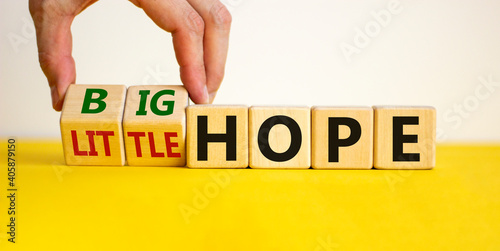 Little or big hope symbol. Hand turns wooden cubes and changes words 'little hope' to 'big hope'. Beautiful yellow table, white background, copy space. Business and hope concept.
