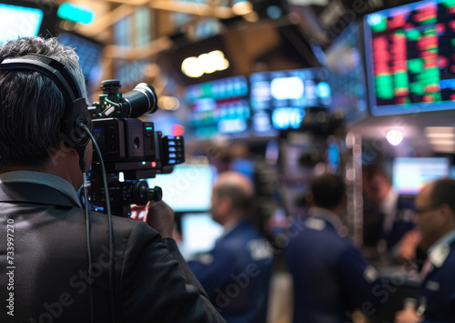 live, report, financial, journalist, stock, exchange, floor, trader, screen, finance, business, news, media, market, trading, activity, action, movement, energy, excitement, risk, opportunity, strategy, decision, concept, background, illustration, professional, realistic, modern, digital, device, camera, microphone, headset, suit, attaching, watch, colours