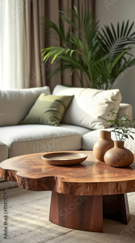 table, wood, vase, plant, living, room, hot drink, modern, interior, design, home, decor, natural, pedestal, footed, small, green, light, coloured, sofa, neutral, toned, curtain, calm, stylish, furniture, style, minimalist, simple, elegant, tranquil, serene, peaceful, comfort, relaxation, sophistication, texture, warmth, organic, contemporary