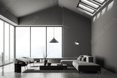 living room, interior, armchair, sofa, panoramic, window, countryside, open space, chill, room, decoration, guest, hall, minimalist, couch, dark, dresser, stylish, coffee table, lounge, studio, reading, space, corner, carpet, grey, concrete, floor, seat, modern, art, book, style, loft, lamp, architecture, house, apartment, contemporary, cosy, relax, new, luxury, design, wall, three-dimensional, render, rendering, illustration