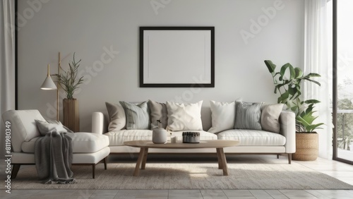 Living Room Mock-Up: Modern Cozy Interior with Empty Canvas Frame and Furniture Render Suitable for Buildings and Architecture Interior Design