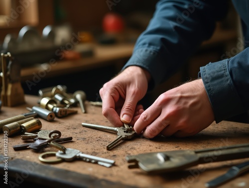 Locksmith crafting a key with locks and tools scattered across the workbench