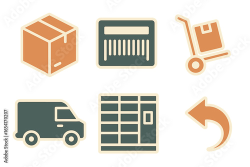 Logistics and delivery service icons: package, barcode, hand truck, van, warehouse shelves, and return arrow