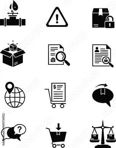 logistic, problem, security, information, business, global, warning, lock, box, package, document, magnifying glass, map, pin, cart, bill, chat, question, scale, justice, leak, risk, solution, support, management, datum, assessment, financial
