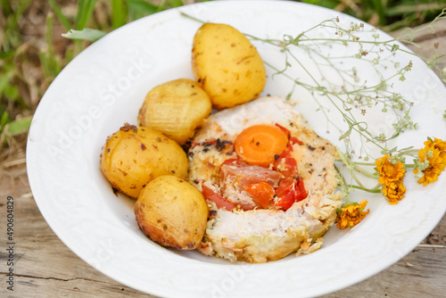 Loin in exotic dish with potato and onion herbs.