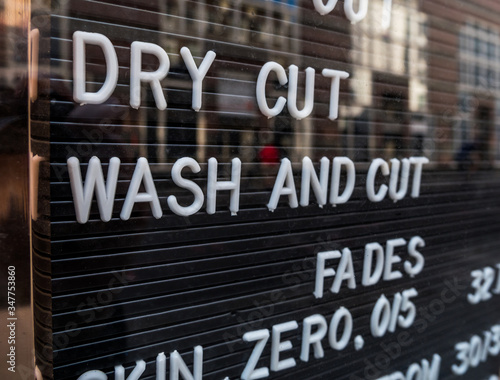 London, UK. May 9th 2020: A barber shop shop price board. Hairdressing and styling. Coronavirus, lockdown, stay at home, social distancing, back to work, small business, economy, finance, re-open.
