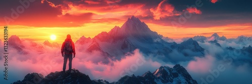 mountain, sunset, adventurer, surreal, cloud, peak, snow, landscape, sky, horizon, breathtaking, solitude, wonder, exploration, nature, travel, panoramic, picturesque, majestic, adventure, wilderness, outdoors, vibrant, twilight, scenery, expedition, serene, wanderlust, journey, atmospheric