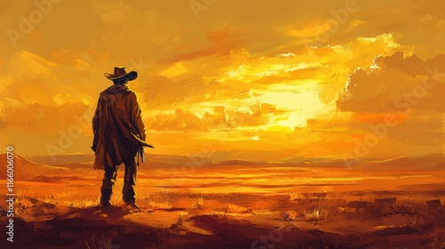 cowboy, desert, sunset, solitude, adventure, wild west, silhouette, landscape, dune, wind, coat, gold, horizon, western, calmness, travel, exploration, mystery, warmth, nature, scenery, open, barren, huge, majestic, freedom, evening, dusk, orange, yellow, grand, quiet, peace, wilderness, timeless, immensity, isolation, explorer, journey, atmospheric, glow