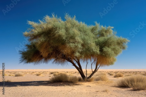 Lone Tamarisk Tree (Tamarix articulata) Standing Resiliently Amidst the Sahara Desert's Arid Sands Under Clear Blue Skies
