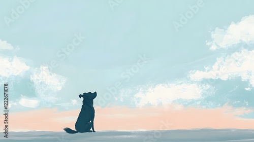 Lone tower silhouette against pastel sky, minimalistic landscape with clouds creating a serene and tranquil atmosphere.