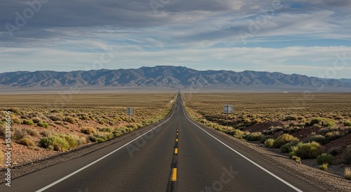 road, desert, mountain, landscape, long, empty, straight, distant, cloudy, sky, bare, vegetation, arid, scenic, natural, rural, panoramic, dramatic, huge, travel, adventure, exploration, driving, highway, roadway, mountain, desolate, sunny, cloud, horizon, nature, mountain view