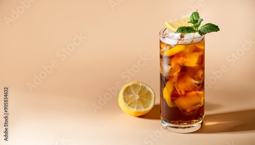 long island ice tea cocktail with vodka rum tequila gin liquor lemon juice cola and ice garnished with lemon slice and mint in highball glass beige background hard light