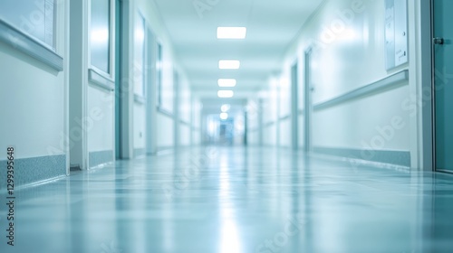 hospital, corridor, hallway, medicals, health care, sterile, clean, bright, light, blue, green, floor, wall, long, perspective, depth, empty, space, calm, order, interior, architecture, design, building