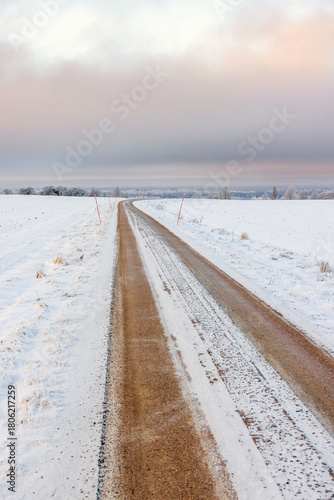 Long straight dirt road over snowy field towards the horizon