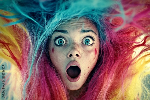 Long trim - multicolored hair. Commercial commercial concept pattern design idea. Pretty very amazed mixed-race girl - for ads, banner and internet use. Colored hair creative advertising.