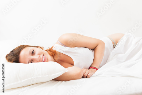 bed, woman, bedchamber, white, awake, beautiful, morning, beauty, home, pillow, smile, person, 1, relax, up, resting, pretty, face, girl, sleep, female, portrait, arousing, smiling, red-haired, dream, alone, adult, peaceful, eye, waking, look, long, wake up, arouse, rouse, awaken, long-haired, happy, lying, sitting, to sit