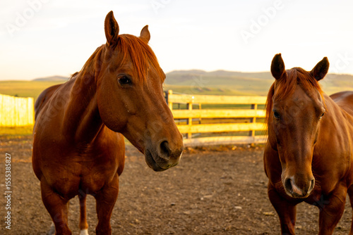 Longview, Alberta - June 8, 2025: Horses and cattle on the Tongue Creek Ranch at sunset
