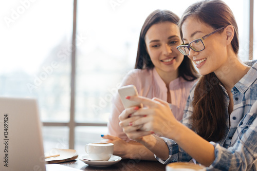 business, casual attire, woman, young, student, asian, office, work, cafes, hot drink, break, meeting, colleague, friends, friendship, smiling, pretty, carefree, brunette, sharing, looking, picture, photograph, generation, device, technology, mobile, phone, smartphone, social, media