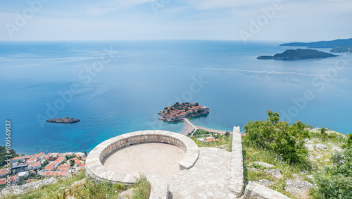 montenegro, balkans, mediterranean, island, causeway, paseo, connected, connecting, fortified, wall, village, protection, wall, surrounding wall, bay, water, sea, ocean, turquoise, adriatic, coast, coastline, shore, seascape, beach, sand, church, religion, sky, blue, mountain, mountain chain, hotel, copy space, no people, looking down, view, viewpoint