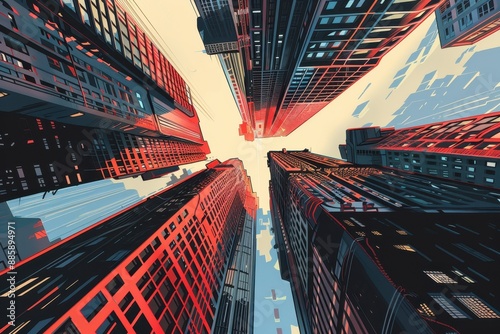 Looking Up at Futuristic Cityscape with Red and Blue Buildings