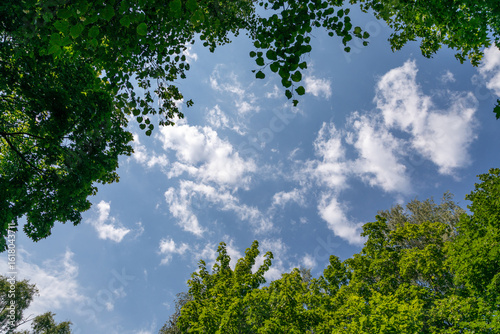 blue skies, cloud, green leaf, looking up, foliage, nature, summer, peaceful, serene, white cloud, daylight, sunny day, environmental, timberland, greenery, fresh air, relaxation, meditation, tranquil, calm, landscape, scenic view, natural beauty, organic, growth, life, vitality