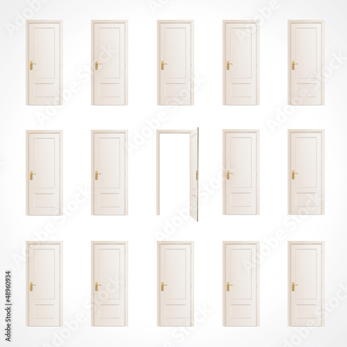 Lot of white doors and one open. Vector design.