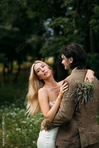 beautiful, bouquet, bride, bridegroom, couple, day, elegant, forever, green, groom, happy, hug, hugging, just, just married, kiss, kissing, love, man, married, nature, outdoors, park, people, portrait, pretty, romance, romantic, special, spring, standing, summer, sunny, together, wedding, wedding day, woman