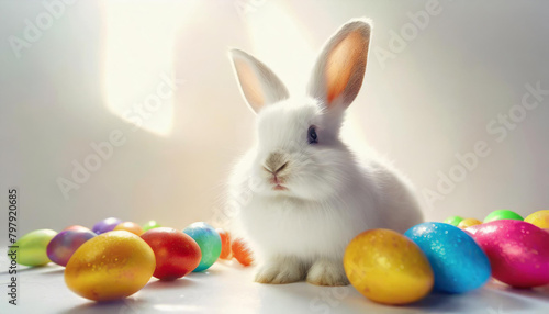 Lovely bunny easter fluffy baby rabbit with a basket full of colorful easter eggs. Beautiful Easter card. Generative AI