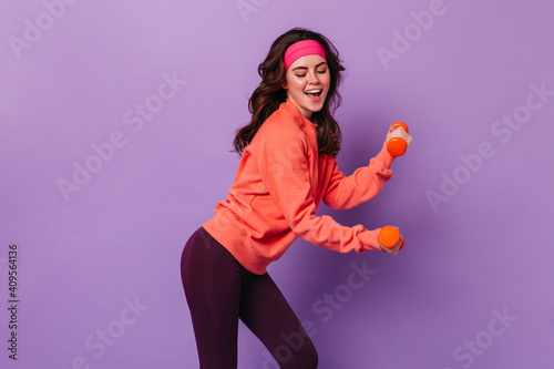 Lovely girl in black leggings and orange sweatshirt does aerobics with dumbbells
