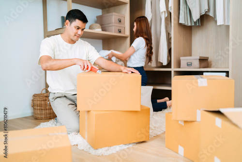 lover unpack storing new cloth room together. wife and husband picking cloth in the packaging box relocating to new living location wardrobe. lover unpack box helping decorating new closet together