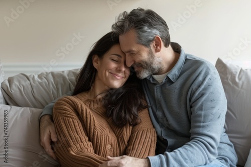 loving, couple, smiling, embracing, sofa, home, comfortable, casual attire, affectionate, happy, man, woman, togetherness, joy, human relationships, indoor, living room, content, middle-aged, warmth, happiness, casual clothes, love, family, bonding, mature, lifestyle, relaxation, portrait, peaceful, adult, hugs, hug, marriage, partnership, serene, together, trust, well-being, cheerful, contentment, european, husband, wife, rest, security, sitting, union, white