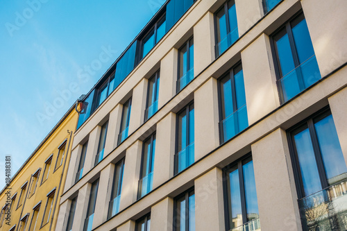 architecture, building, city, house, diagonal, grey, perspective, real estate, low angle, facades, wall, modern, blue, sky, window