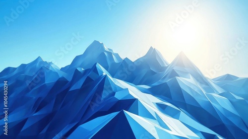 Low poly mountain range, cool blue tones, sharp geometric shapes, modern design, abstract landscape, digital art, serene atmosphere
