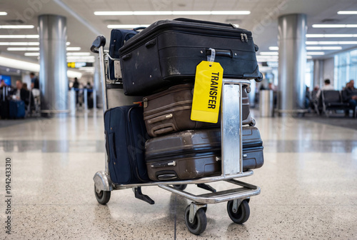 Luggage cart loaded with suitcases in an airport terminal. Yellow TRANSFER tag.