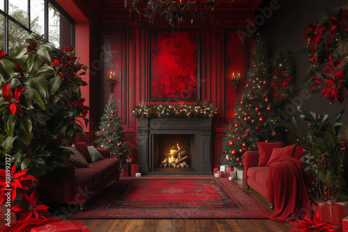 Luksusowy salon z kominkiem, kanapami i choinkami, bogato ozdobiony świątecznymi dekoracjami w kolorze czerwieni, tworzący elegancki nastrój.