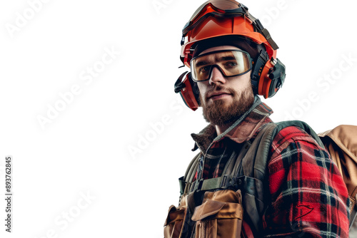 Lumberjack in protective gear isolated on white background