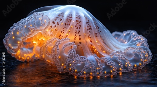 jellyfish, ocean, sea, underwater, marin, wildlife, nature, animal, creature, aquatic, life, glow, light, dark, water, beauty, mesmerizing, glowing, iridescent, radiant, aglow, specimen, macro, photo, closeup, detail, texture, vibrant, colours, orange, white, black, deep, fauna, invertebrate, night, illuminated, abstract, art