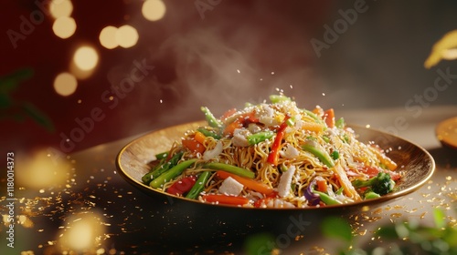 Lunar new year celebration tossed longevity noodles with vegetables festive setting culinary delight