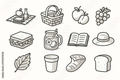 vector, icon, bread, slice, lemonade, book, tree, basket, lunch, leaf, jar, sandwich, blanket, fruit, picnic, cup, hat, collection, ink, minimal, artistic, vignetting, hand-drawn, set, crayons, outline, doodle, rough, creative, drawing