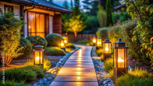 Lush garden path, modern home glows, lantern light trails, deep focus, tranquil evening.