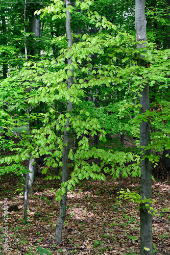 Lush green bright leaves of beech tree in forest.