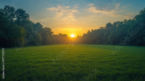 Lush green field at sunset with trees in the background.