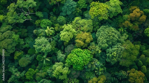 Lush green forest canopy with diverse tree species, vibrant colors and intricate details, visually stunning